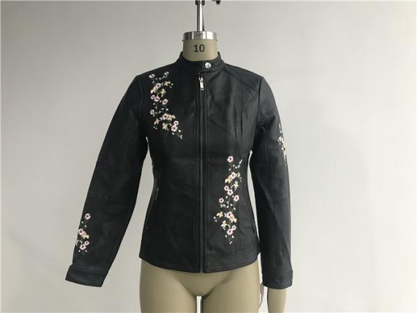 Multi Color Pu Leather Coat , Black Embroidered Mandarin Collar Flower Tw78425 Images |